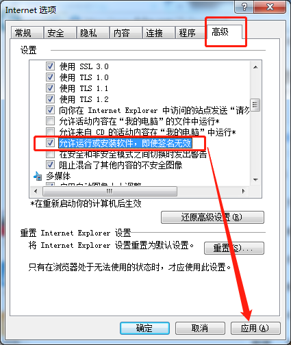 2.2 然后选择高级选项卡,勾选图中的选项后,点击应用按钮
